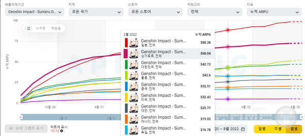 누적 ARPPU는 일본이 가장 높고, 이어 싱가로프, 대한민국, 홍콩의 순이었다가 최근 전세가 역전되어 홍콩이 대한민국을 넘어서 3위를 차지하고 있는 상황이다.