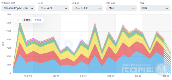 당시 2020년 10월을 기점으로 원신의 매출은 서서히 하향 안정화 단계로 진입했고, 21년 4월과 6월에는 가장 낮은 매출을 기록 중이었다. 이후 원신 2.0 버전이 출시되면서 게임에 대한 관심이 집중됐고, 이는 곧 매출로 연결됐고, 2021년 8월 원신은 출시 시기와 맞먹는 최고의 매출을 올리게 된다. `