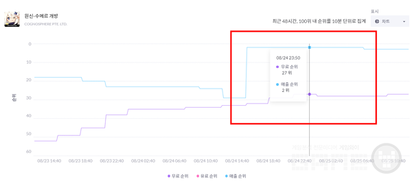 순위 상승은 24일 오후 4시쯤 시작됐다. 같은 날 오후 2시 29위였던 애플 매출 순위는 구글 매출 2위로 껑충 뛰어 올랐다. 이후 26일 오전 7시경 ‘히트2’가 출시되면서 3위로 밀려났다. 한편 무료 순위는 아직 상승세가 지속되는 중이다. 23일 52위였던 무료 순위는 꾸준히 우상향을 그리며 상승 중이고, 25일 현재 무료 27위를 기록 중이다.