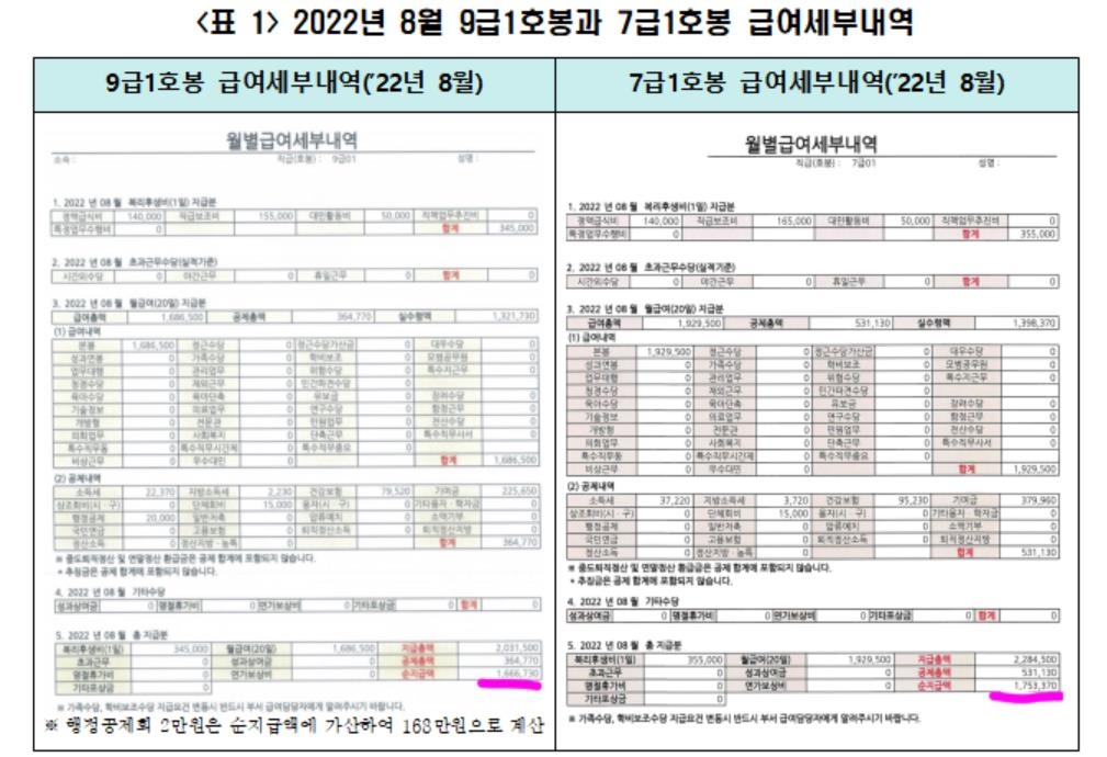 서공노는 7급 1호봉(9급 3호봉)도 9급 1호봉보다 7만 원 정도 많은 175만 원 안팎에 불과하다고 전했다. 역시 지급총액은 220여만 원이지만, 공제총액이 53만여 원에 달해 순 지급액이 170만 원대로 나타났다.