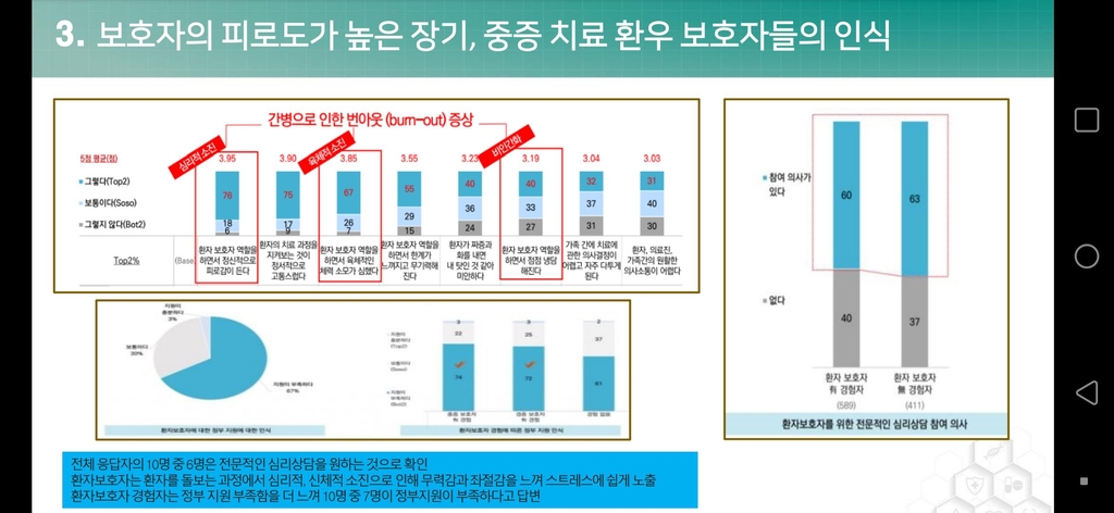 가족 간병인의 이런 문제는 결국 환자의 간병에 부정적인 영향을 미칠 뿐만 아니라 보호자 또한 '숨은 환자'로 전락하게 될 우려가 큰 만큼 정부와 사회가 나서 이들을 위한 조력 방안을 찾아야 한다는 게 이 교수의 주장이다.