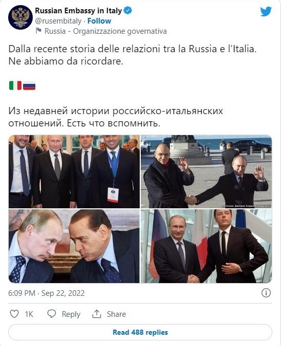 주이탈리아 러시아 대사관은 22일(현지시간) 공식 트위터, 페이스북 등에 푸틴 대통령이 최근 몇 년간 만난 이탈리아 정치 지도자들과 찍은 사진을 공개한 뒤 "최근 러시아와 이탈리아 관계의 역사에서 우리에겐 약간의 추억이 있다"고 썼다.