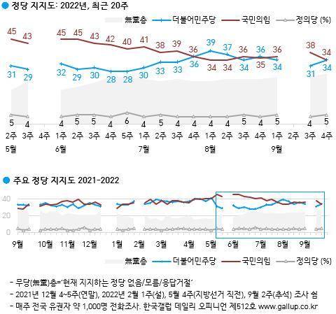 전주 조사 대비 국민의힘 지지도는 4%포인트 하락했고, 민주당 지지도는 3%포인트 상승한 것이다.