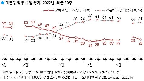 직전 조사(9월 3주차) 대비 긍정평가는 5%포인트 하락(33%→28%)한 반면, 부정평가는 2%포인트 상승(59%→61%)했다.