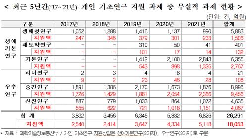 이 의원이 과학기술정보통신부에서 받은 자료를 보면 지난 5년(2017∼2021년)간 개인 기초연구 지원과제 중 실적을 못 낸 과제는 총 2만6천291건, 사업 규모는 총 1조8천억여 원이었다.