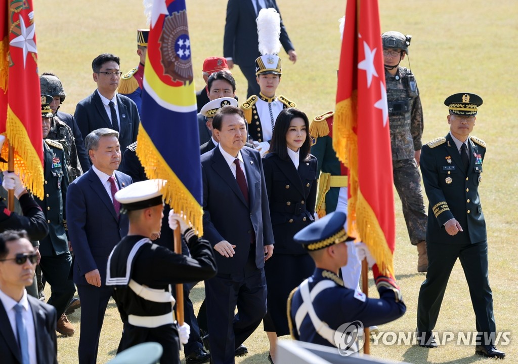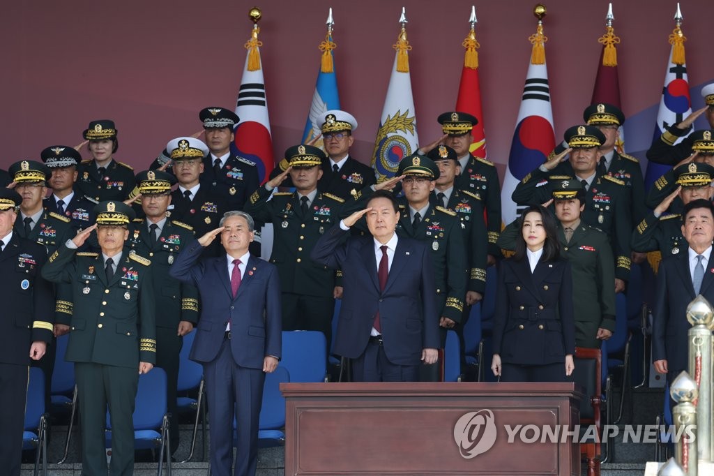 윤 대통령은 기념사에서 "대한민국의 땅과 바다, 하늘에서 국토방위의 소임을 다하는 국군과 해외 파병 장병 여러분의 헌신과 노고에 감사드린다"고 말했다.