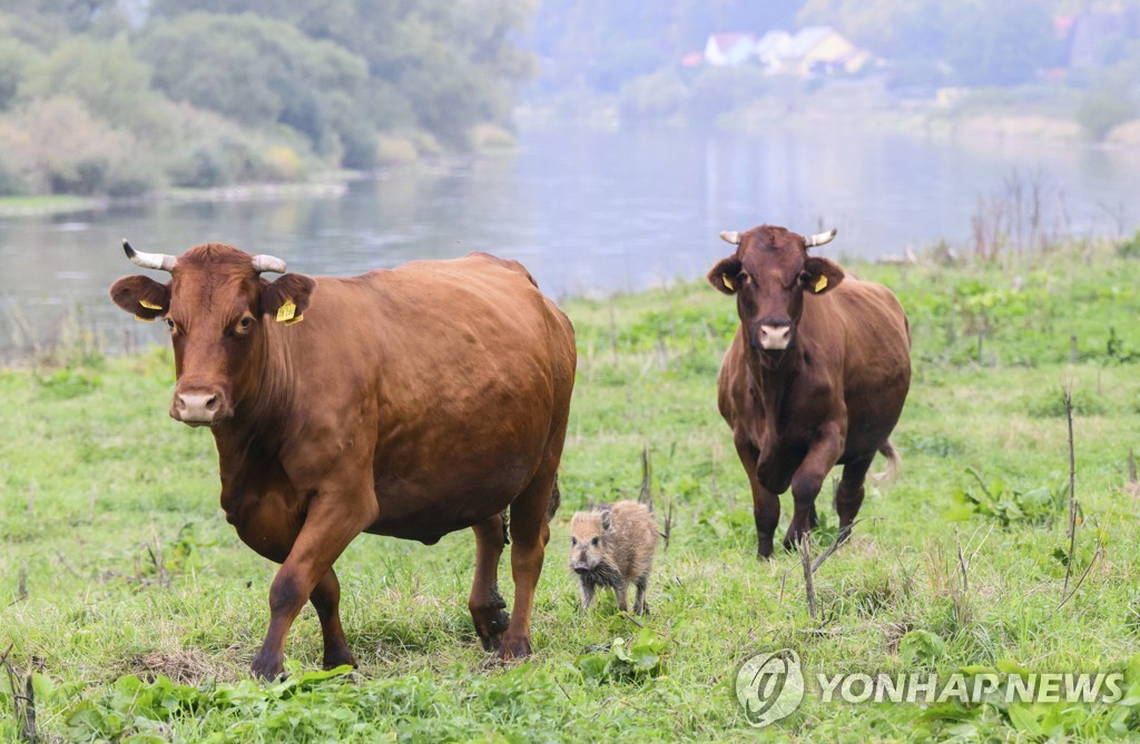 (서울=연합뉴스) 윤종석 기자 = 독일의 한 시골마을에서 어미와 떨어져 갈 곳을 잃은 야생 멧돼지 새끼가 방목 중인 소떼 무리에 정착해 화제다.