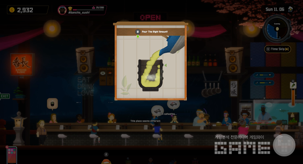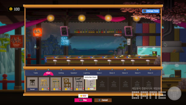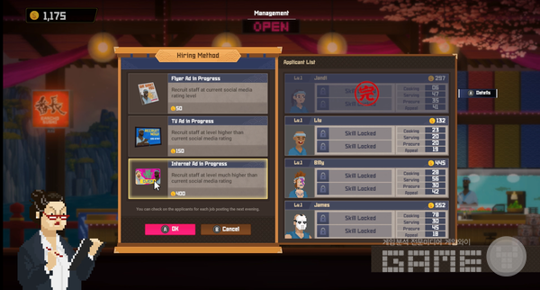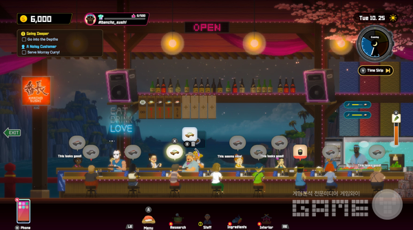 - 경영: ‘요시에’의 도움을 받아 ‘데이브’의 일손을 도울 직원을 모집하고 교육할 수 있다. 직원의 스킬에 따라 서빙, 요리 등을 교육하고 배치할 수 있다. ‘반쵸스시’의 매력을 높여줄 인테리어도 가능하며, 확장을 통해 더 많은 손님도 수용할 수 있다.