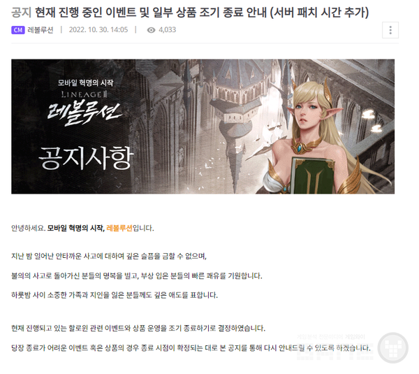 핼러윈 이벤트를 진행했던 엔씨소프트의 '리니지M'과 '리니지2M,' 넷마블의 '세븐나이츠 레볼루션'과 '리니지2 레볼루션' 등에서도 할로윈 이벤트 조기 종료 결정을 내렸다.