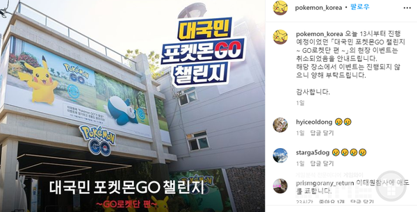 한편 포켓몬코리아도 30일 이태원에서 진행 예정이었던 '대국민 포켓몬GO 챌린지 ~ GO로켓단 편 ~'의 현장 이벤트를 취소했다.