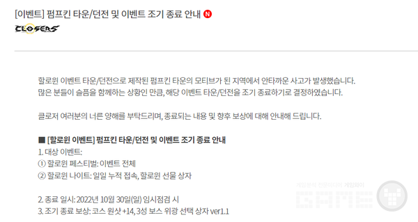넥슨 클로저스 운영자는 "핼러윈 이벤트 타운/던전으로 제작된 펌프킨 타운의 모티브가 된 지역에서 안타까운 사고가 발생했습니다. 많은 분들이 슬픔을 함께하는 상황인 만큼, 해당 이벤트 타운/던전을 조기 종료하기로 결정하였습니다. 클로저 여러분의 너른 양해를 부탁드리며, 종료되는 내용 및 향후 보상에 대해 안내해 드립니다."며 조기 종료 사실 및 보상안에 대해 밝혔다.
