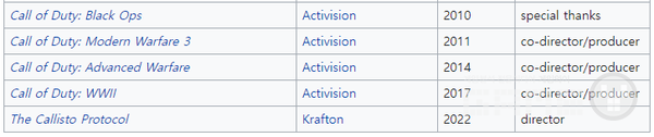그중 ‘콜 오브 듀티 블랙옵스’는 직접적 개발이 아닌 '특별한 감사(Special Tanks)' 정도로 언급되어 있다. 하지만 나머지 타이틀은 글렌 스코필드가 핵심 디렉터 역할을 맡았다.