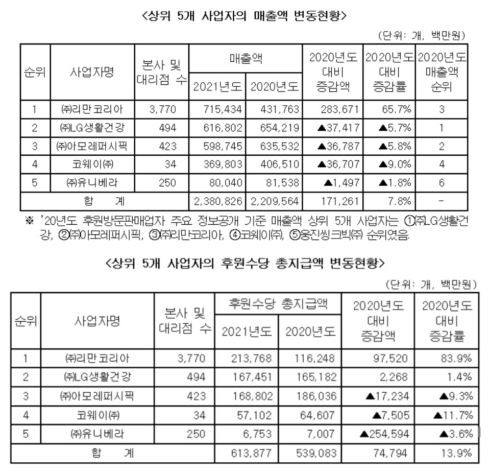 리만코리아는 본사·대리점 수가 3천770개, 전체 판매원 수가 59만350명으로 다른 업체보다 압도적으로 많았다.