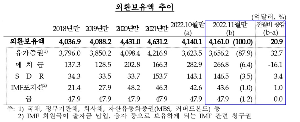 한은이 5일 발표한 외환보유액 통계에 따르면 11월 말 기준 외환보유액은 4천161억달러로, 10월 말(4천140억1천만달러)보다 20억9천만달러 증가했다.