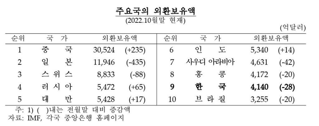 한국의 외환보유액 규모는 10월 말 기준(4천140억달러)으로 세계 9위 수준이다.