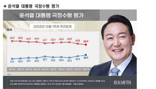 리얼미터가 미디어트리뷴 의뢰로 지난달 28일부터 이달 2일까지 전국 만 18세 이상 성인 남녀 2천507명을 대상으로 조사한 결과, 윤 대통령의 국정 수행에 대한 긍정 평가는 38.9%, 부정 평가는 58.9%로 나타났다.
