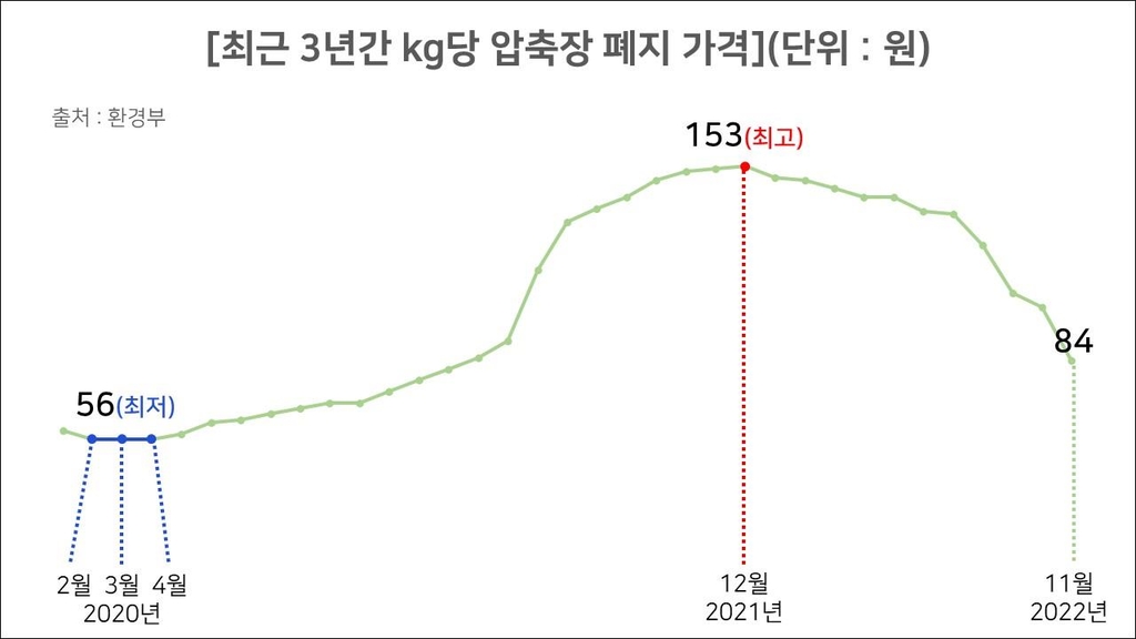 중국이 폐지 수입을 축소했던 2020년 초만 하더라도 압축장 기준 폐지 가격은 ㎏당 56원에 머물렀다. 최근 3년간 최저치다. 이후 꾸준히 오르면서 지난해 12월 153원으로 정점을 찍었다. 그러다가 올해 들어 하락세로 돌아서며 지난 11월에는 84원까지 떨어졌다. 1년 새 가격이 거의 반 토막 난 것이다.
