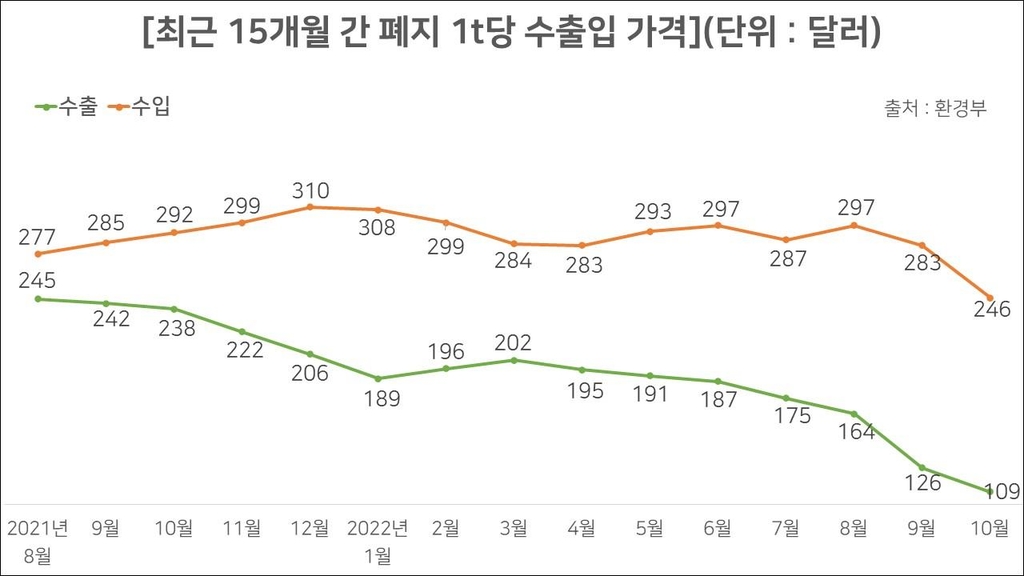 1t당 폐지 수출 가격은 지난 3월만 하더라도 200달러가 넘었지만, 10월에는 109달러까지 떨어졌다.