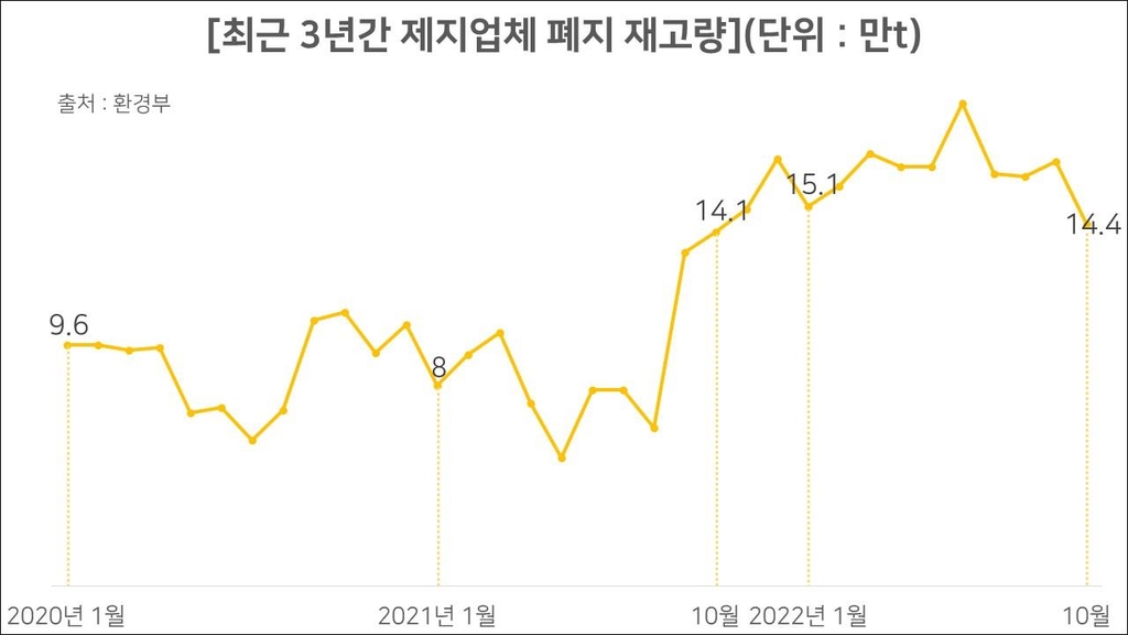 환경부에 따르면 지난 10월 기준 국내 제지회사의 폐지 재고량은 14만4천t에 이른다. 공공 비축창고로 넘어간 물량을 제외한 수치임에도 지난해 같은 시기보다 3천t 더 늘어났다.