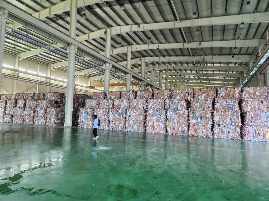 한국환경공단이 관리하는 1만2천여㎡(3천630평) 규모의 비축창고 두 곳에는 수도권 등에서 넘어온 광고지와 컵라면 용기, 동화책, 선물 포장지, 택배 상자 등 다양한 종이를 압축해 만든 약 1.2m 크기의 폐지 더미 수백 개가 4∼5m 높이로 빼곡히 들어차 있었다. 축구장(7천140㎡) 면적의 약 두 배에 달하는 이곳에 보관된 폐지량은 9천t에 달한다.
