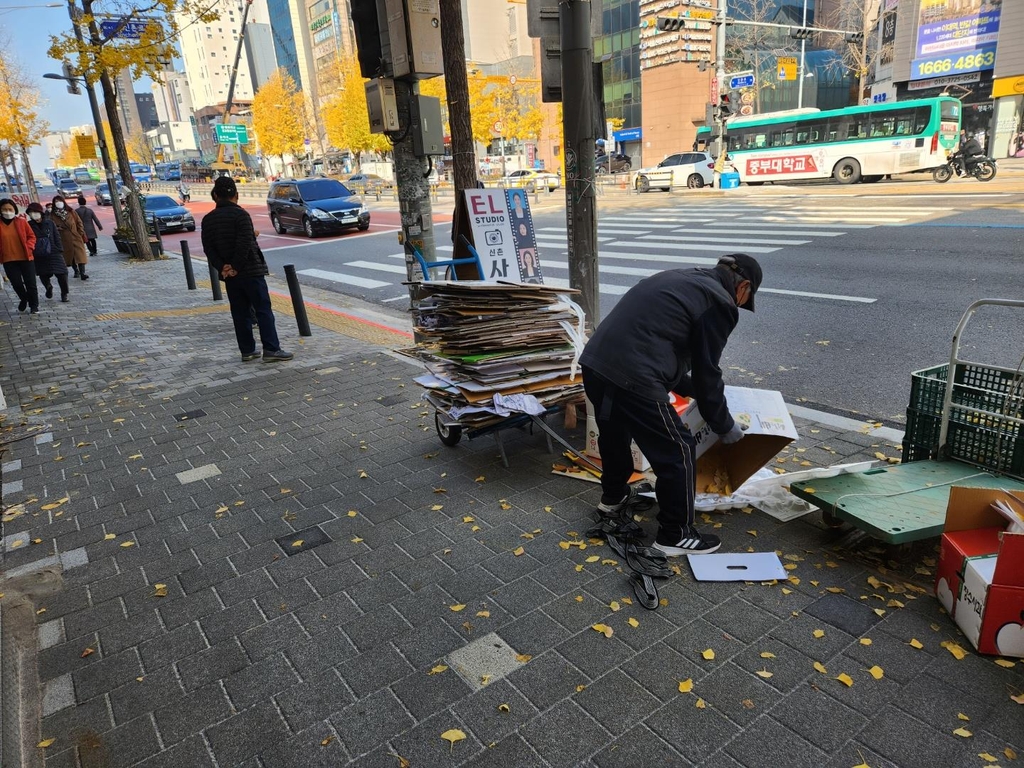 7년째 폐지 등을 모아 생계를 이어가고 있는 그는 "오전 4∼5시에 일어나 동네 곳곳을 돌면서 폐품을 수거해도 만 원짜리 한 장 손에 쥐기가 어려워졌다"며 "여름철만 해도 3만 원은 넘게 벌어갔는데…"라며 한숨을 내쉬었다.