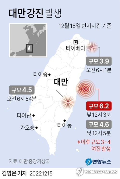 (서울·타이베이=연합뉴스) 오진송 기자 김철문 통신원 = 15일 낮 12시 3분(이하 현지시간) 대만 동부 해역에서 규모 6.2의 지진이 발생했다고 대만 중앙기상국이 발표했다.