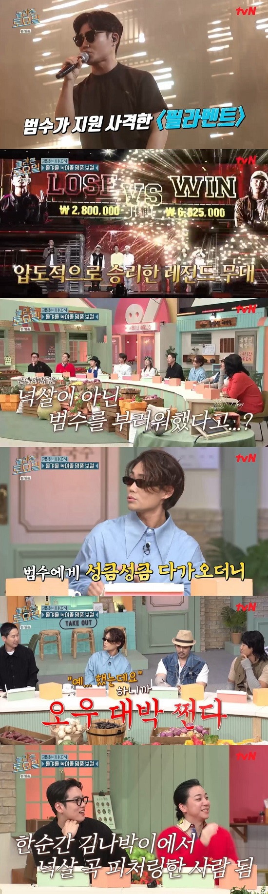 이에 넉살은 "준결승 때 범수 형님이 '필라멘트' 무대를 도와주셔서 시원하게 이겨버렸던 기억이 있다"고 레전드 무대가 탄생할 수 있었던 계기를 설명했다.