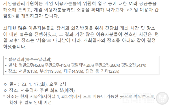 지난 12월 30일, 게관위는 공지사항을 통해 17일 오후 2시 서울역 주변 회의실에서 게임 이용자 간담회를 진행한다고 밝혔다. 12월 21일에 진행한 간담회 관련 설문조사에서 나온 결과를 토대로 간담회가 진행하는 것이다.
