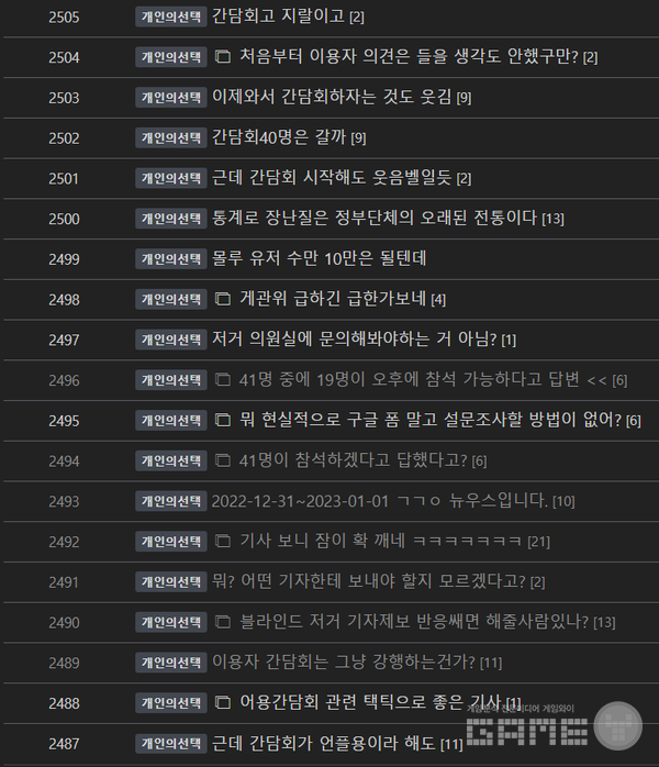 이에 대해 이용자들은 당연하다는 듯이 부정적인 반응을 보이고 있다. “도대체 이걸 누가 참가하냐?”, “41명만을 위해서 간담회를 진행하나?”, “오후 2시에 집착하는 이유가 궁금하다”, “서울역 주변인 것이 게관위 직원들을 위해서인가?” 등 간담회에 대한 거부감과 불만을 표출하고 있다.