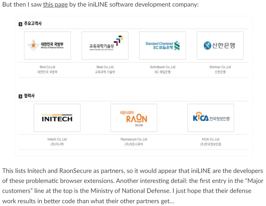 그는 이전에 올린 분석 글에서 한국이 액티브X를 사용한 역사적 배경과 보안 플러그인 설치 실태를 분석하면서 "이들 보안 소프트웨어가 보안에 도움이 되지 않지만, 이해관계 때문에 의도적으로 설계됐다"고 주장했다.