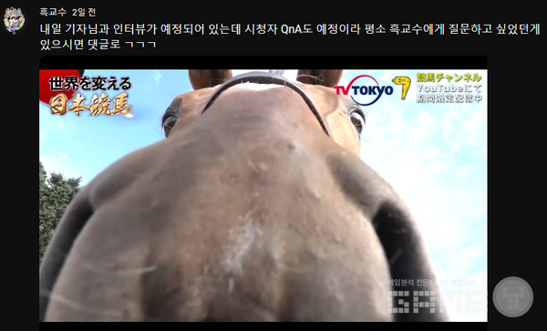 그 질문에 “포르쉐 박스터는 우마뾰이를 춤춰 주지 않는다!”라는 대답으로 반격하며, ‘흑교수’가 얼마나 ‘우마무스메’에 진심인지 바로 느끼게 해줬다. 그는 자신의 유튜브 채널을 통해 ‘우마무스메’ 이용자들에게 챔미 정보, 미래시, 육성 정보 등을 공개하고 있다고 했다.