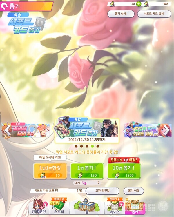 A : 한국 서버 이용자들에게 곧 다가올 1주년 직전 픽업 기간쯤이라고 생각한다. 파인모션 육성마와 서포트 카드, 신년 가챠, 나리타 탑로드 서포트 카드 등이 준비되어 있다. 특히 크리스마스를 시작으로 신년까지, 이용자들이 좋아할만한 '우마무스메'와 서포트 카드들이 등장해, 모아왔던 쥬얼이 삭제되는 픽업 기간이다.