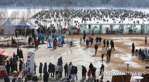 화천군 화천읍 화천천에서 열리고 있는 산천어축제장에는 낮 기온이 영하로 떨어졌지만, 많은 관광객이 찾아 얼음벌판에서 낚시하며 하루를 보냈다.