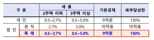 정부는 또 공공주택사업자 등 공익적 법인이 주택을 3채 이상 보유한 경우 종부세를 매길 때 중과 누진세율(0.5∼5.0%)이 아닌 기본 누진세율(0.5∼2.7%)을 적용하기로 했다.