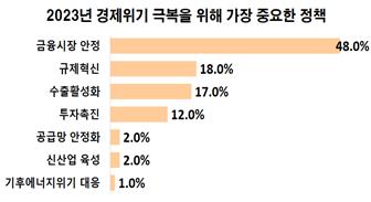 당면한 경제위기 극복을 위한 정책으로는 '금융시장 안정화'라는 응답이 48.0%로 가장 많았다.