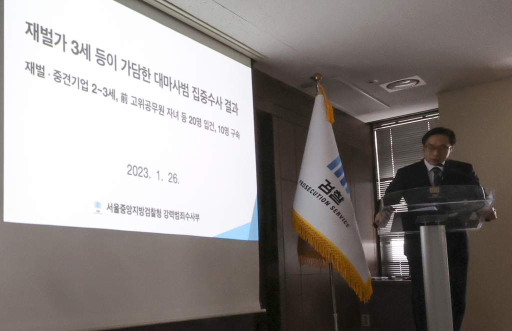 (서울=연합뉴스) 최재구 기자 = 26일 서울중앙지검 브리핑실에서 열린 '재벌가·연예인 연루 대마사범 집중 수사 결과 발표'에서 신준호 중앙지검 강력부장이 브리핑하고 있다.