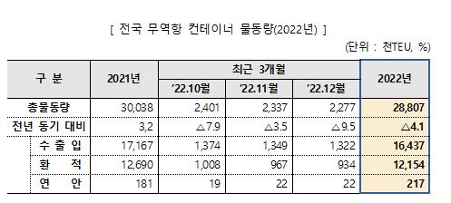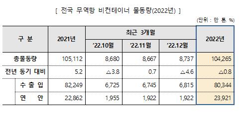 수출입 물동량은 우크라이나 전쟁 장기화, 세계경기 둔화에 따른 영향으로 전년 대비 3.5% 감소한 13억472만t으로 집계됐다.