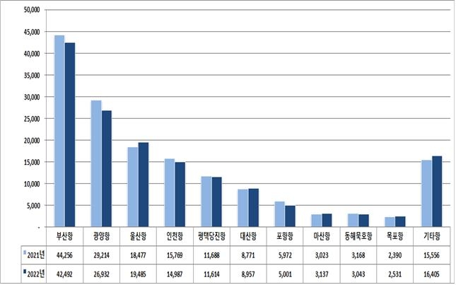 광양항(-6.8%), 인천항(-5.7%) 등은 감소했으나 평택·당진항(0.5%), 울산항(6.1%), 대산항(2.3%) 등은 증가했다.