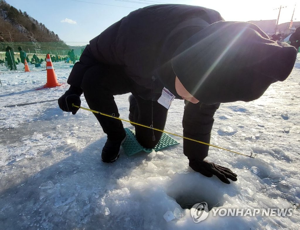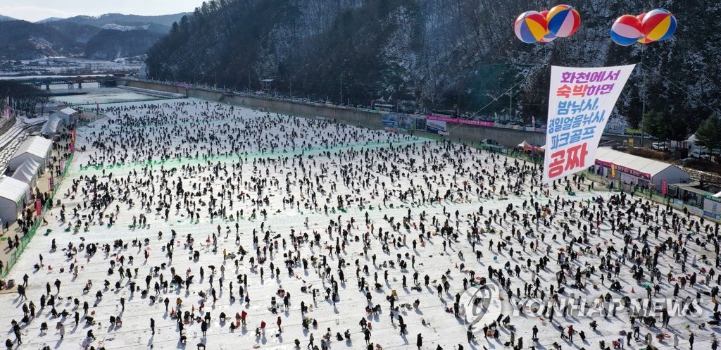 화천천을 따라 이어진 얼음낚시터에는 2만여 개 구멍마다 낚싯대를 드리운 관광객이 빼곡히 자리를 차지했다.