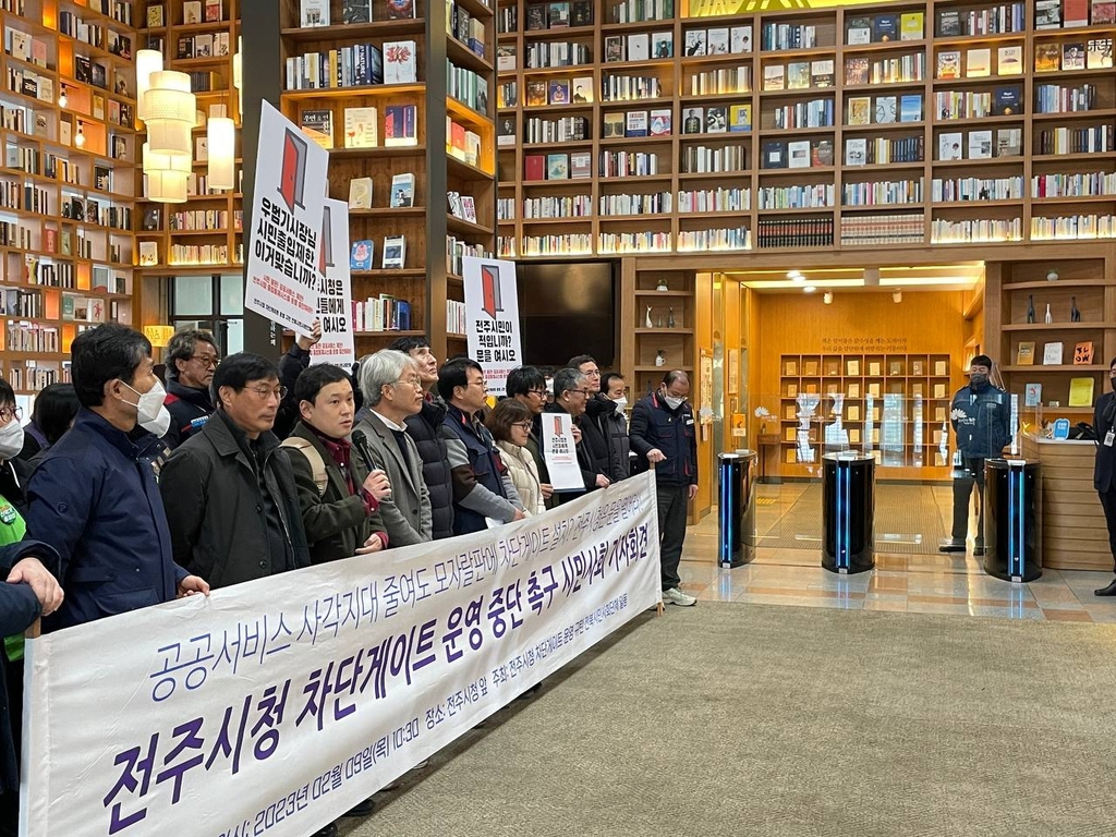 전북평화와인권연대 등 33개 단체는 이날 전주시청 앞에서 기자회견을 열고 "전주시는 시민 차단 게이트 운영을 즉각 철회하라"고 촉구했다.