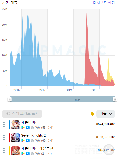이 게임은 2014년 출시된 국내에서는 신화적인 존재의 모바일게임이다. 하지만 10년의 세월을 비껴가지는 못했다. 앱매직 데이터에 따르면 이 게임의 글로벌 매출은 2016년 피크를 기록했다가 2019년 이후 급격하게 매출 그래프가 무너지기 시작했다. 이후 '세븐나이츠2'가 등장하면서 이전의 전성기를 누리는가 했으나 꾸준하게 하향 안정화됐다. 이 게임의 뒤를 위어 ‘세븐나이츠 레볼루션’이 등장했으나 이전타이틀 만큼의 매출 그래프는 기록하지 못하고 하향세로 돌아선 상황이다.