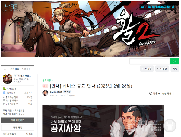 네시삼십삼분도 28일 모바일게임 '활2' 서비스를 종료한다. 회사는 지난 1월 27일 공식 카페를 통해 이 같은 소식을 알렸다.