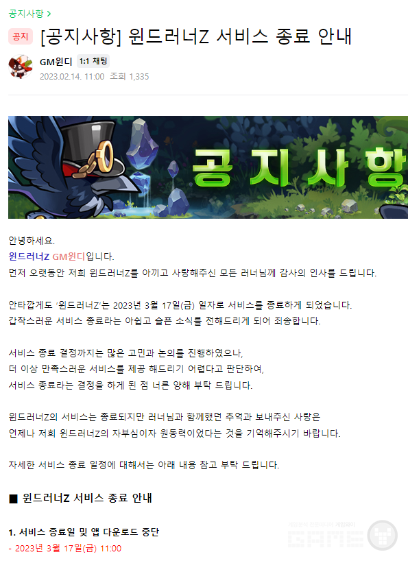우선 위메이드맥스가 3월 17일자로 '윈드러너Z'의 서비스를 종료한다. 운영진은 "갑작스러운 서비스 종료라는 아쉽고 슬픈 소식을 전해드리게 되어 죄송하다."면서 "서비스 종료 결정까지는 많은 고민과 논의를 진행하였으나, 더 이상 만족스러운 서비스를 제공 해드리기 어렵다고 판단하여, 서비스 종료라는 결정을 하게 됐다"고 전했다.