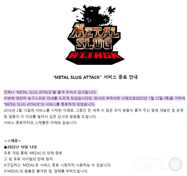 SNK에서 제작한 '메탈슬러그 디펜스'의 후속작이자 '메탈슬러그' 시리즈의 20주년 기념 타이틀 '메탈슬러그 어택'도 1월 12일 서비스가 종료됐다.