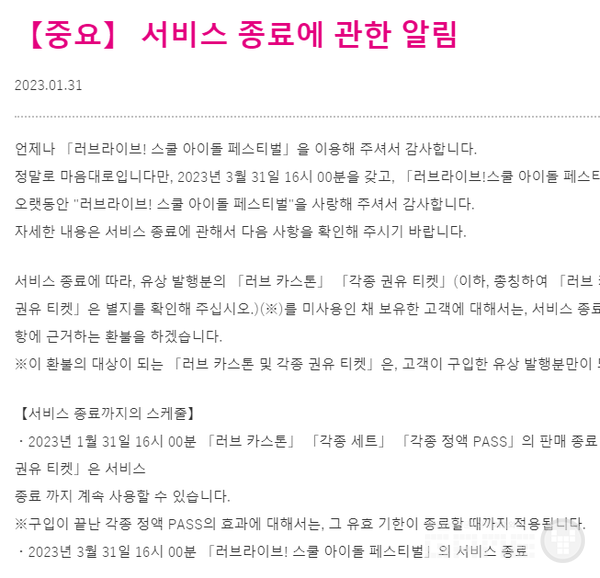 같은 날 '러브라이브! 스쿨 아이돌 페스티벌'도 서비스가 종료된다. 공식 약칭은 스쿠페스(スクフェス)다. 국내는 케이랩이 2014년부터 서비스한 모바일 리듬액션 게임이다. 국내는 2016년 서비스가 통합됐고, 다시 2021년 일본 서비스통합, 3월 31일 최종 서비스가 종료된다.