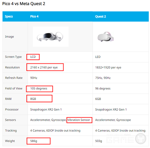 '피코4 vs 퀘스트2'. 스펙만 보면 피코4는 오큘러스 퀘스트2에 밀리지 않는다. 출시일만 보면 2020년과 2022년이라는 시간적인 차이가 난다. 거기에 470그램과 295그램의 무게 차이, 최대 시야각 등에서 차이가 난다. 가격은 둘 두 비슷한 40만 원대다.