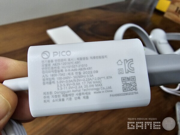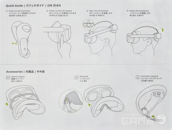 구성품으로는 VR헤드셋(모델명 A8110)과 컨트롤러 2대와 끈, 1.5배터리4개(기기 내 삽입), 렌즈 스페이서, 노즈패드, 어댑터와 USB2.0 데이터 케이블 등이다. 13세 이상 이용가이며, 필수 확인 사항에는 올인원VR과 관련된 내용이 있다. 여기에는 스마트폰에서 VR Assistant for PICO 앱을 다운로드 및 설치한 다음, 피코 계정을 신규 등록하고 VR헤드셋에서 로그인하라고 되어 있다. 피코 스토어에서 콘텐츠를 구매하여 싱글 또는 멀티 온라인게임을 즐겨보라는 내용과 함께 말이다.