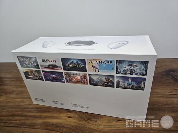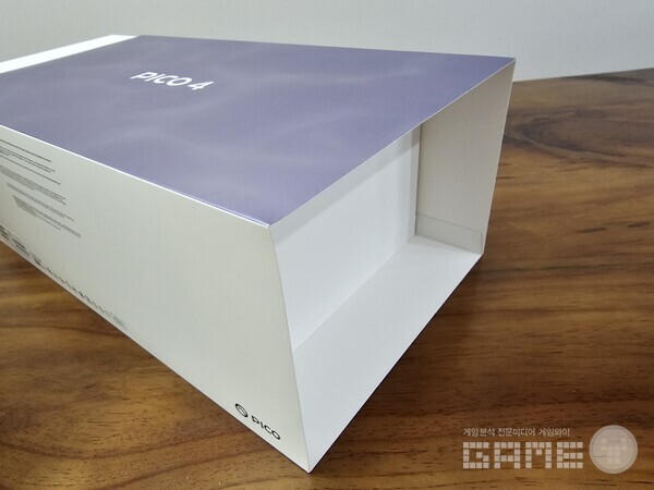 피코4 박스 외관은 보라색 무늬의 묵직한 느낌의 외형이 특징이다. 꽤 부피감과 무게감이 있다. 포장 뒷면에는 어떤 게임들이 잘 나가는지 한 눈에 알 수 있다. 올 인원 스포츠와 테니스, 데메오(DEMEO), 오쉐이프(OHSHAPE), 애프터 더 폴(AFTER THE FALL) 등의 게임이 피코4 박스 한 면에 새겨져 있다.
