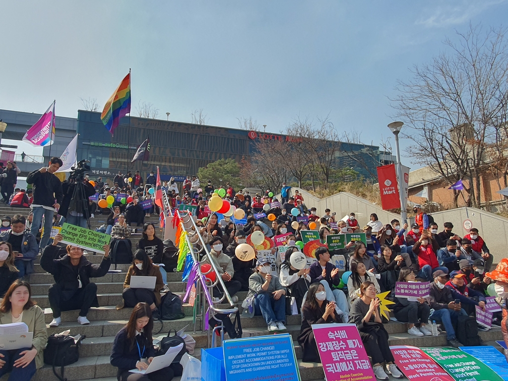 이주노동자노조, 한국이주여성인권센터 등 54개 시민단체 소속 140여명은 이날 오후 서울역 광장 앞에서 '2023 세계 인종차별 철폐의 날 기념대회'를 열었다.