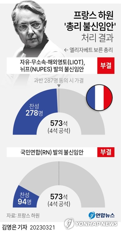 (파리=연합뉴스) 현혜란 특파원 = 프랑스 정부가 의회 입법 절차를 건너뛰면서까지 연금 개혁을 밀어붙이는 데 반발해 야권이 제출한 엘리자베트 보른 총리 불신임안 두 건이 모두 하원 문턱을 넘지 못했다.